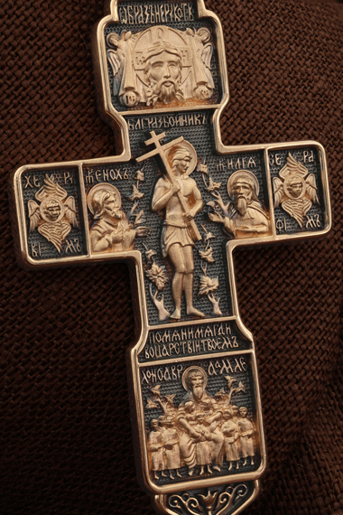 На концах горизонтальной балки креста помещены образы вселенских святителей и творцов литургии Василия Великого и Иоанна Златоуста. В кулонном кольце изображены райские врата с их стражем — Херувимом. Врата, которые открылись благодаря крестной жертве Христа.
