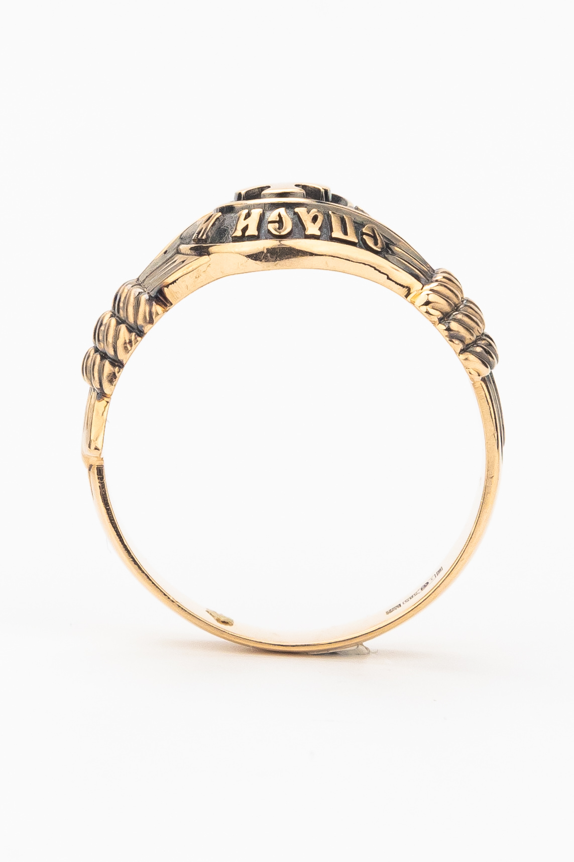 В центральной части лицевой стороны кольца изображен Крест. Господь сказал: кто хочет идти за Мною, отвергнись себя, и возьми крест свой, и следуй за Мною. Крест является символом жертвенной любви Всеблагого Бога к падшим людям, всепобеждающим духовным оружием христиан, основанием и средоточием церковной жизни. Иисус Христос, как искупительная жертва освобождения человечества от власти греха, умер крестной смертью и в третий день воскрес. Крест имеет четырехконечную форму с равными балками. Такого типа кресты существовали во многих дохристианских культурах и были в первую очередь использованы Церковью для выражения идеи христианского преобразования мира. Вокруг креста помещена молитва: «Спаси и Сохрани».