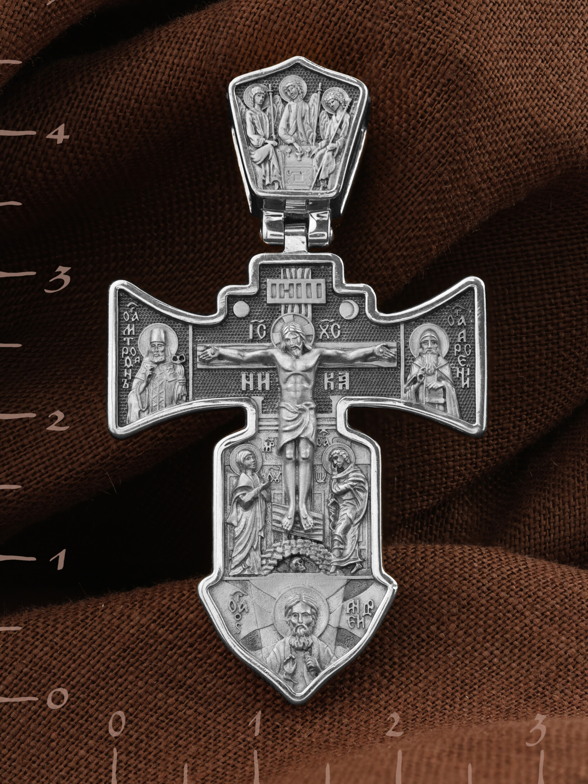 На лицевой стороне креста изображено Распятие Господа Иисуса Христа.
