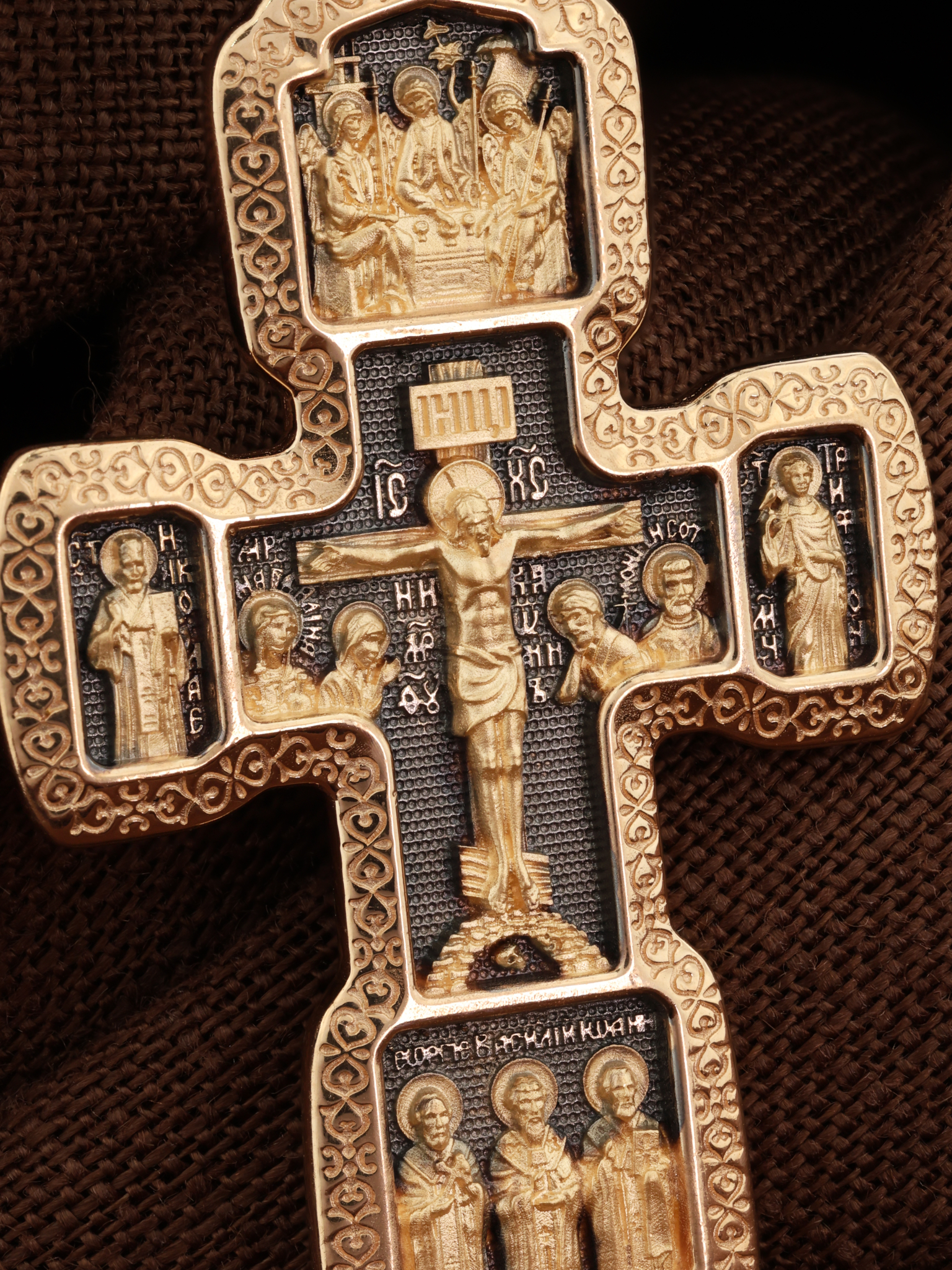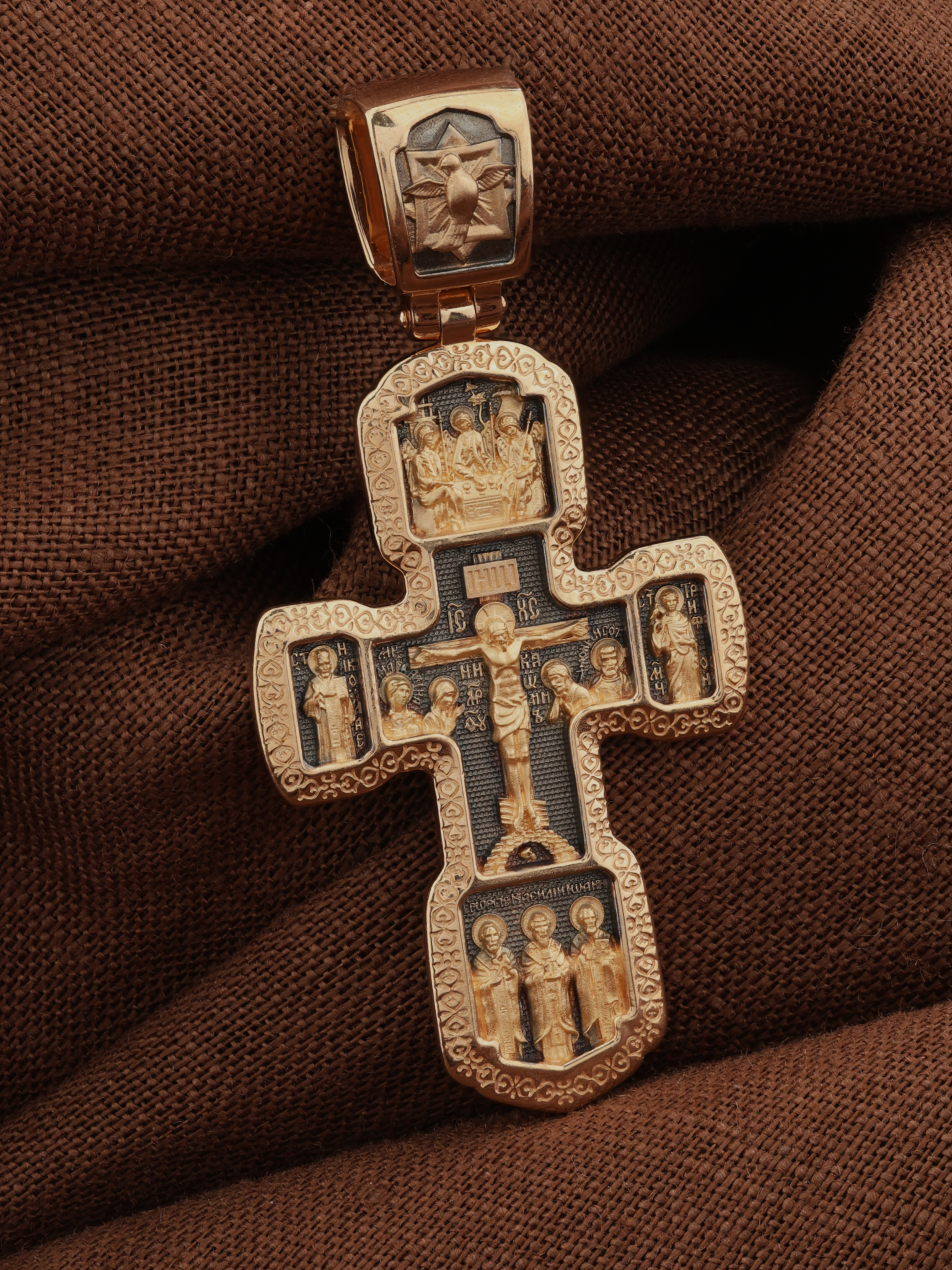 Центральную часть лицевой стороны занимает Распятие Господа Иисуса Христа с предстоящими Ему святыми, которые, по преданию, находились у Креста Господа во время Его казни. Слева — Пресвятая Богородица и жены-мироносицы — равноапостольная Мария Магдалина и святая Мария Клеопова, справа — праведный Иосиф Аримофейский и мученик Лонгин Сотник. Над Распятием помещена икона Святой Троицы. Ангелы сидят за трапезным столом вокруг чаши, которая символизирует грядущую жертву Второго Лица Пресвятой Троицы, Бога Сына. Слева от Господа находится святой Николая Чудотворец, справа — святой мученик.
