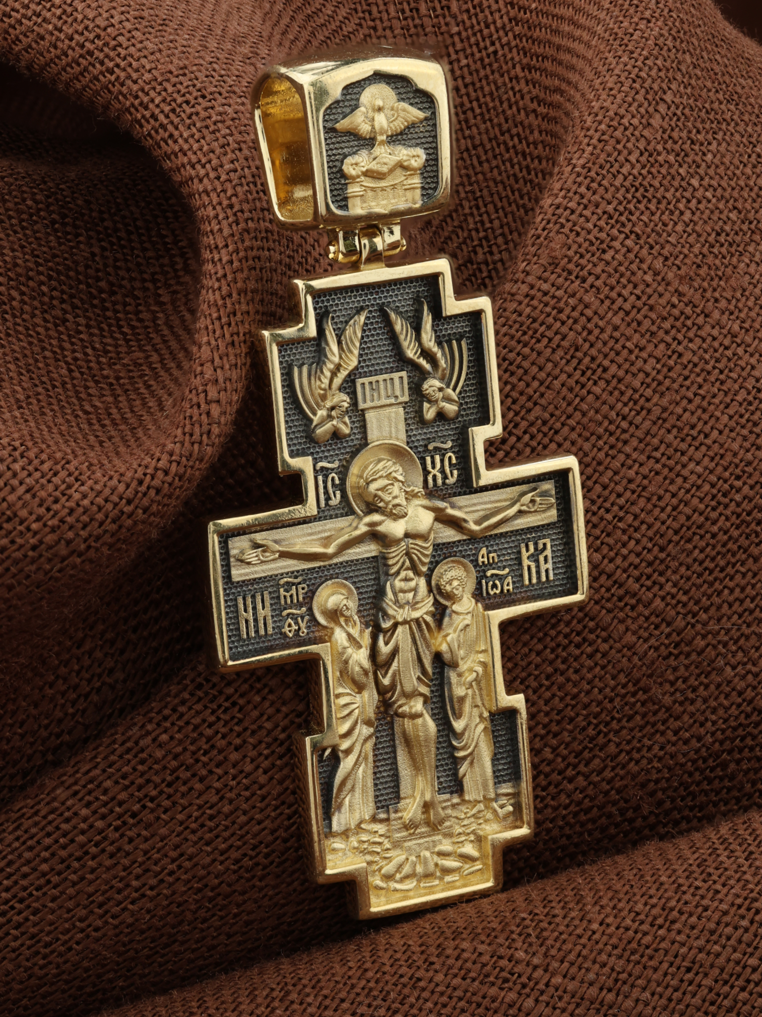 На лицевой стороне креста изображено Распятие Христово — величественный, торжественный образ христианства, знак победы над смертью. Христос, принеся Себя в Жертву на Кресте, искупил грехи всего мира и дал людям возможность обрести спасение. Слева и справа от Креста стоят Богоматерь и апостол Иоанн Богослов. По преданию, именно они до последнего не оставляли Спасителя в Его страданиях, были с Ним до самой смерти. Во главе образка изображен парящий голубь — символ Святого Духа и Его благодати. Сверху над Распятием парят Ангелы. Они изображены летящими с Небес вниз, к Кресту. Ангелы словно поддерживают табличку над головой Спасителя, на которой написано IНЦИ — «Иисус Назарянин Царь Иудейский». Эта табличка — титло — была приколочена римскими палачами как указание на «вину» Христа, то, за что Он был казнен.