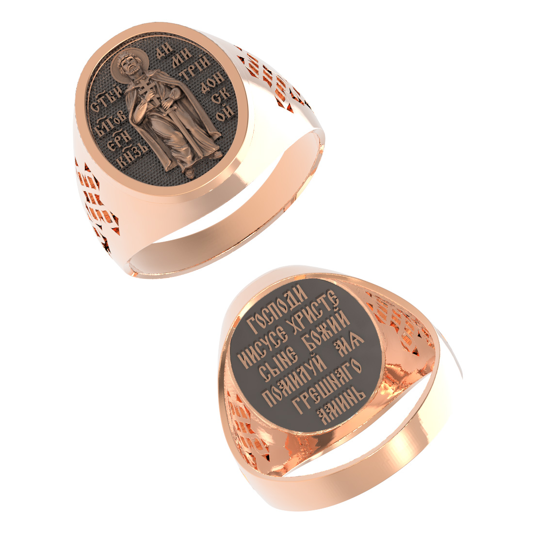 На оборотной стороне кольца отображена молитва Иисусова: «Господи, Иисусе Христе, Сыне Божий, помилуй мя, грешного. Аминь».
