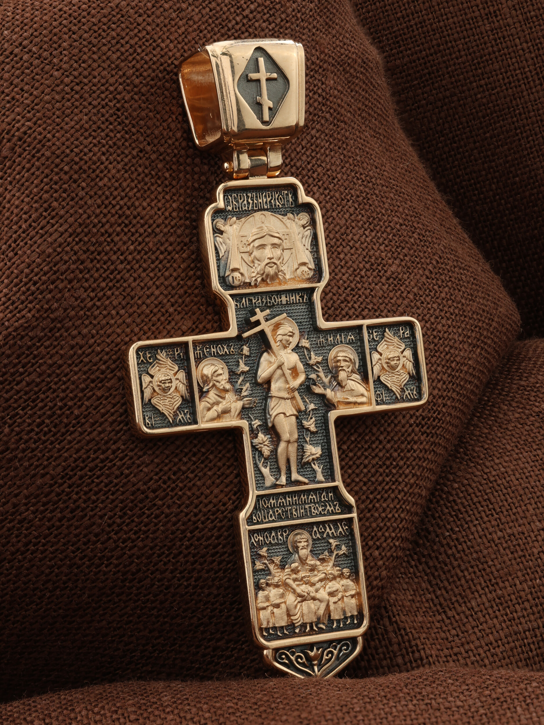 В нижней части креста изображены образы первых русских святых князей-мучеников — Бориса (князь ростовский) и Глеба (князь муромский) и святого равноапостольного князя Владимира. Страстотерпцам Борису и Глебу молятся об умиротворении Отечества, о добром нраве властей и правителей, о сохранении от междоусобицы, о даровании мужества перед лицом смертельной опасности. С Борисом и Глебом неразрывно связан образ их отца — святого равноапостольного князя Владимира, который также почитается как защитник и покровитель Русской Земли и Церкви. В молитвах его называют «отец русский» или «отец всея Руси».