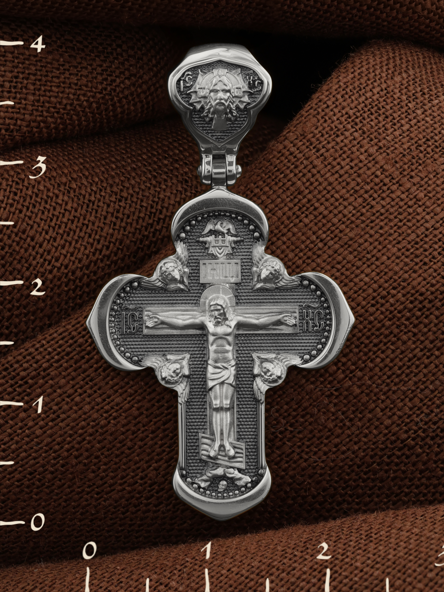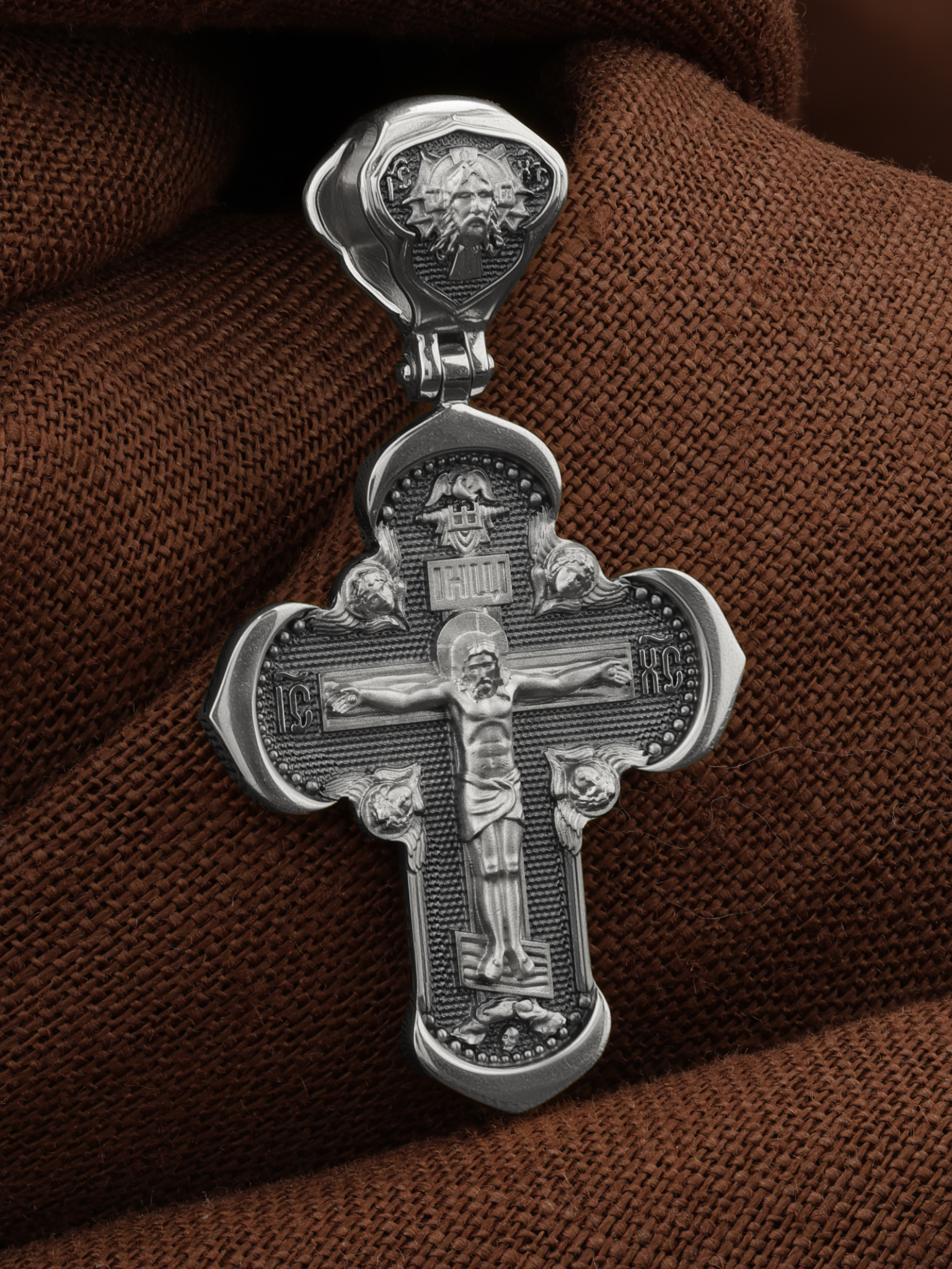 На лицевой стороне креста изображено Распятие Господа и Спасителя нашего Иисуса Христа, отдавшего Себя на смерть, для искупления грехов мира. Крест является символом жертвенной любви Всеблагого Бога к падшим людям, всепобеждающим духовным оружием христиан, основанием и средоточием церковной жизни. Господь сказал: кто хочет идти за Мною, отвергнись себя, и возьми крест свой, и следуй за Мною. (Мк. 8: 34). Над Распятием помещена надпись «Царь Славы». На верхней табличке, выше головы Иисуса, расположена надпись, составленная Понтием Пилатом — «IНЦI». Она означает «Иисус Назорей, Царь Иудейский». Надпись «IC» «ХC», означает Иисус Христос, помещается на разных сторонах поперечной перекладины креста. Возвышение, на котором стоит Крест, символизирует гору Голгофу, на которой произошло Распятие. Под подножием Креста изображена покоящаяся голова (череп) Адама. На кулонном кольце изображен Нерукотворный образ Господа и Спасителя нашего Иисуса Христа, чудесно отпечатавшийся на плате, которым Христос вытер свой лик.