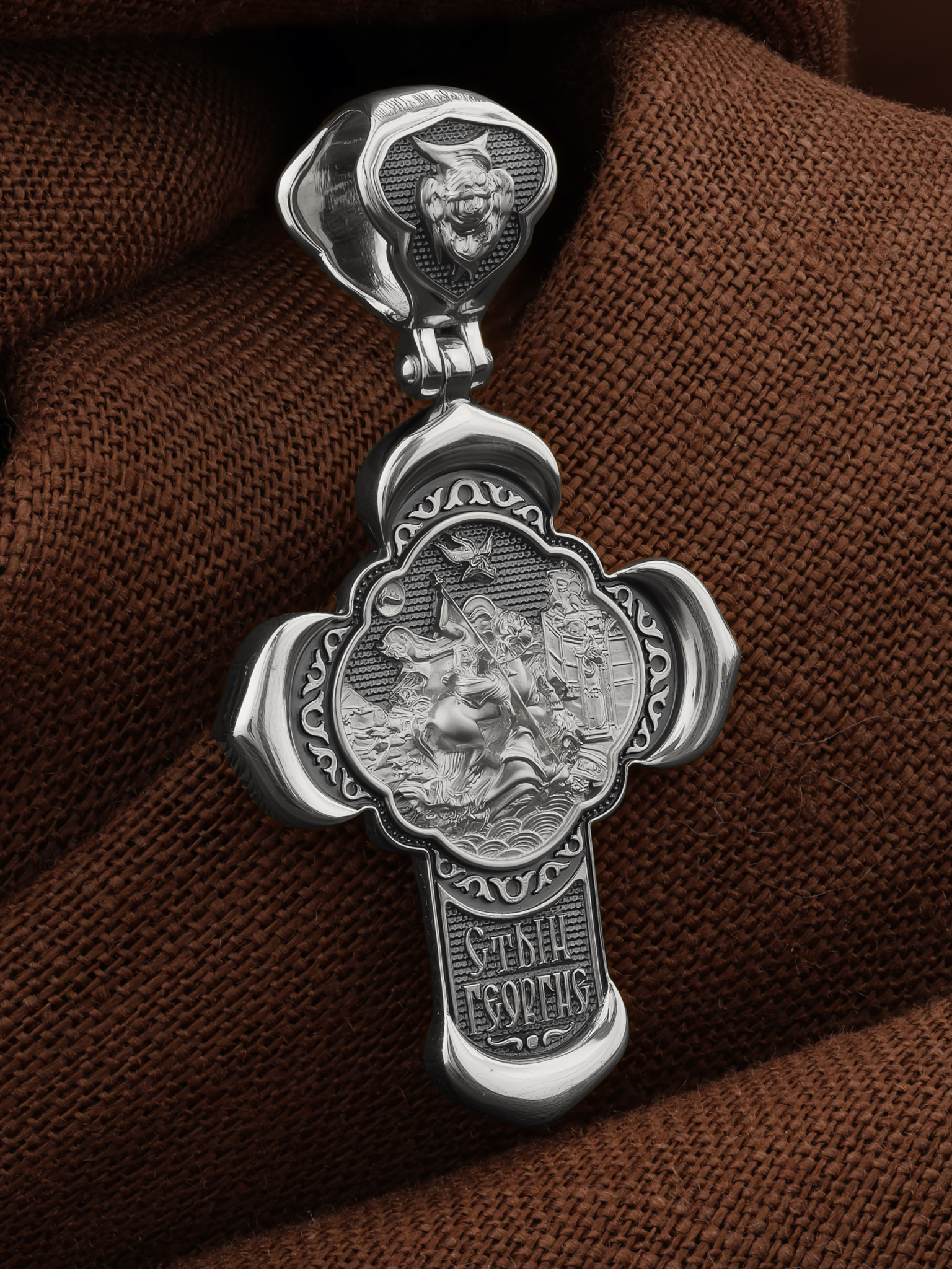 На оборотной стороне креста помещено изображение Святого Великомученика Георгия Победоносца — одного из самых почитаемых и удивительных святых. Георгий родился в Каппадокии (Малая Азия) в семье богатых и знатных горожан. Юношей поступил на службу к римскому императору Диоклетиану, за отличное знание военного дела и проявленную в боях и походах храбрость был приближен к императору и удостоен высокого воинского звания. Во время начавшихся гонений на христиан, перешел на сторону гонимых и, отвергнув человеческий страх, стал ярым проповедником учения Христа. Мучители подвергли опального воеводу жесточайшим восьмидневным пыткам и казнили его (обезглавили) в возрасте около тридцати лет в 303 году. Георгий изображен как воитель, сидящий на вздыбленном коне и поражающий копьем огнедышащего змея. Слева над образом изображена благословляющая Божия десница. Над святым изображен ангел возлагающий на него венец мученика. Змей символизирует собою сатанинские силы. Молитвами вознесенными к Всевышнему и своей непреклонной верой он смог одолеть чудовище. Святой убил змея, спас царскую дочь, принесенную в жертву, и жителей города, их души от влияния дьявола, породив в них надежду и веру в Господа, призывая людей принять христианскую веру. На кулонном кольце изображен шестикрылый Ангел — Серафим.