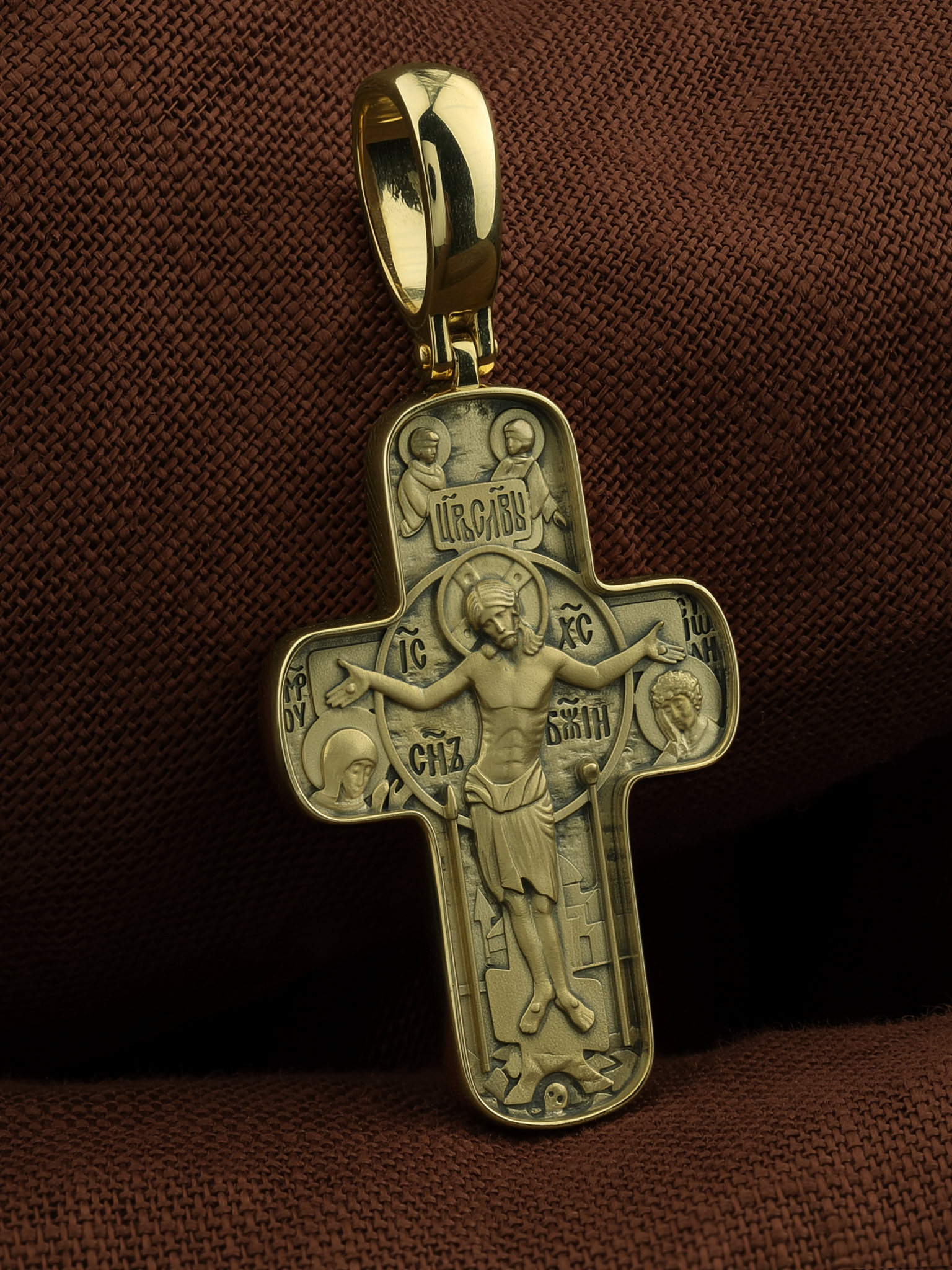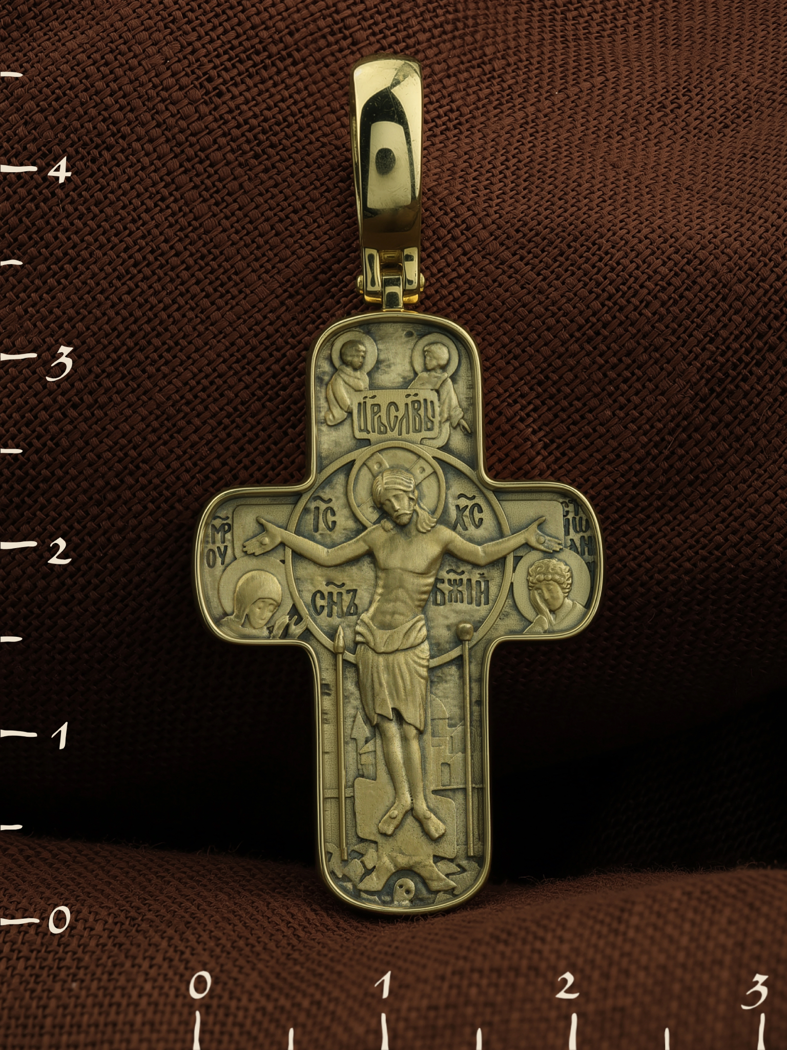 На лицевой стороне креста изображено Распятие Господа и Спасителя нашего Иисуса Христа. Христос, подвергнутый на кресте мучительной казни, своими страданиями искупил нас от древнего греха и даровал нам жизнь вечную. Без Распятия не было бы Воскресения Христова, и поэтому Крест из орудия казни обратился в святыню, в которой действует Благодать Божия. Над Распятием помещена надпись «Царь Славы». Распятие сопровождается надписями, олицетворяющими Христа: «IС» « ХС», что означает Иисус Христос и «Сын Божий». Над вершиной Распятия помещены изображения Ангелов.. Слева от Распятия изображена Пресвятая Богородица, справа — апостол и евангелист Иоанн Богослов, один из ближайших учеников Иисуса Христа. Возвышение, на котором стоит Крест, символизирует гору Голгофу, на которой произошло Распятие. Под подножием Креста изображена покоящаяся голова (череп) Адама