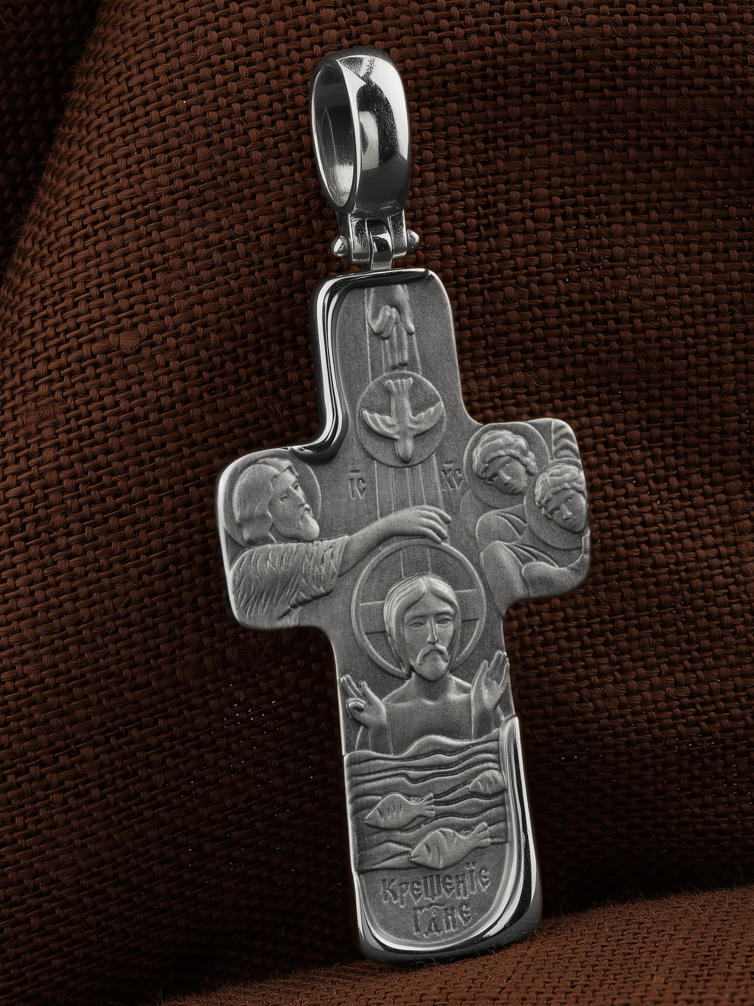 На оборотной стороне креста изображено «Крещение Господне». В образе запечатлено не только Крещение Спасителя во Иордане от Иоанна Предтечи, но, прежде всего, явление миру воплотившегося Сына Божия как Одного из Лиц Святой Троицы, о Котором свидетельствуют благословляющий десницей Отец и Святой Дух, сошедший на Христа в виде голубя. Справа изображены ангелы, склонившиеся ко Христу и, подобно восприемникам от купели, держащие покровы на руках.