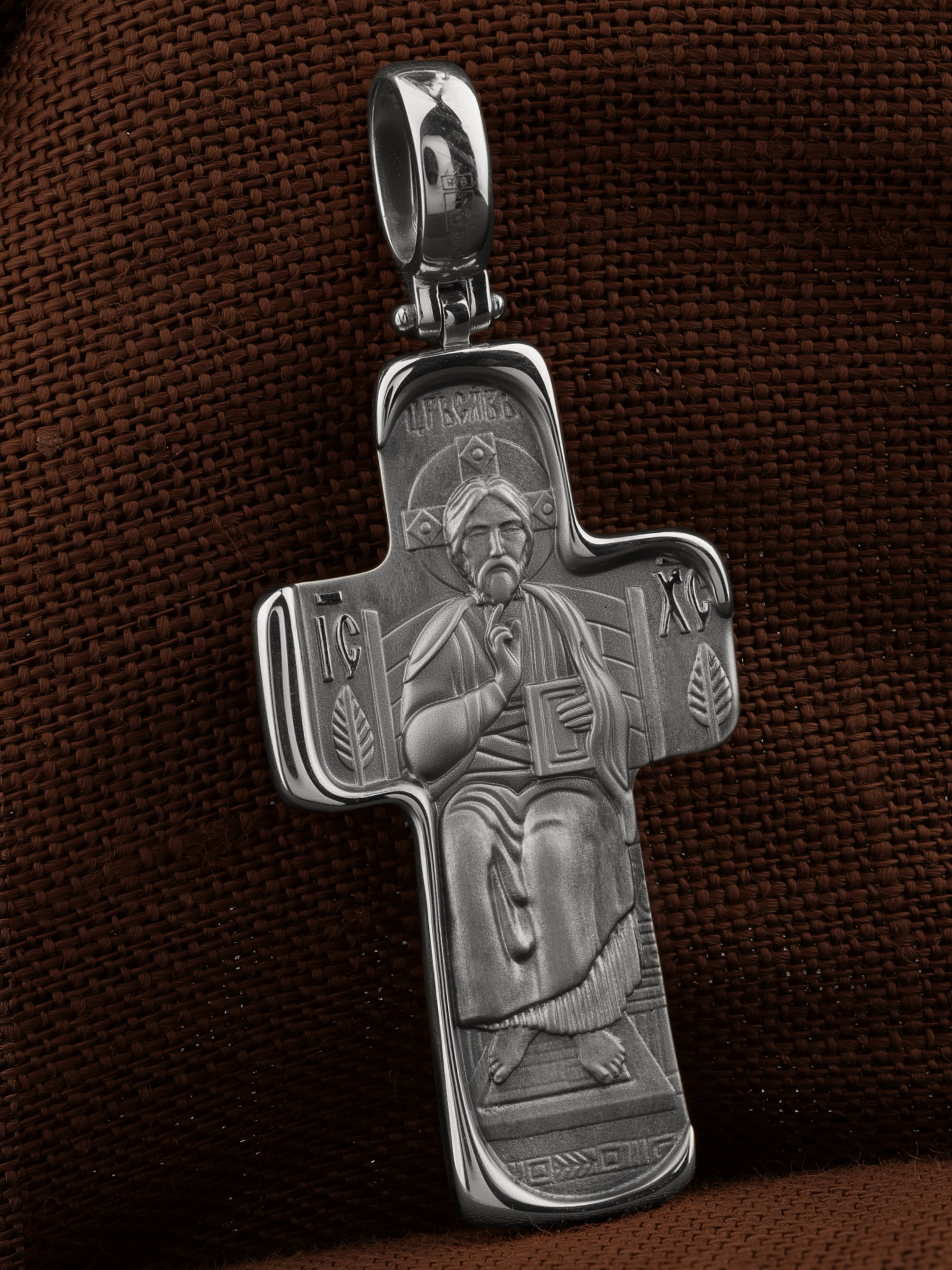 На лицевой стороне креста помещен образ Господа Иисуса Христа «Спас Вседержитель». Он изображен восседающим на престоле. Господь представлен как Царь Небесный и будущий Судия мира. Именование Иисуса «Вседержителем» указывает, с одной стороны, на Его Божественную природу: «Аз есмь Альфа и Омега, начало и конец, говорит Господь, Который есть и был и грядет, Вседержитель» (Откр. 1: 8). С другой стороны, такое именование связано и с человеческой природой Христа, искупившего крестной жертвой людские грехи и обновившего тем самым человеческую природу. В левой руке Он держит открытую Книгу, а правой рукой благословляет. Книга символизирует Евангелие — благую весть, принесенную Христом всему миру. Символизирует и Книгу Жизни, где записаны имена всех, возлюбивших Бога. Образ сопровождается каноническими надписями: «Царь Славы» и «IС ХС», что означает Иисус Христос.