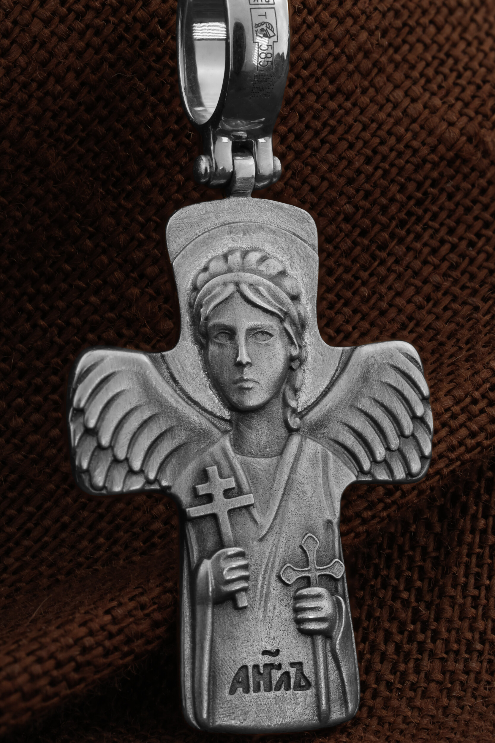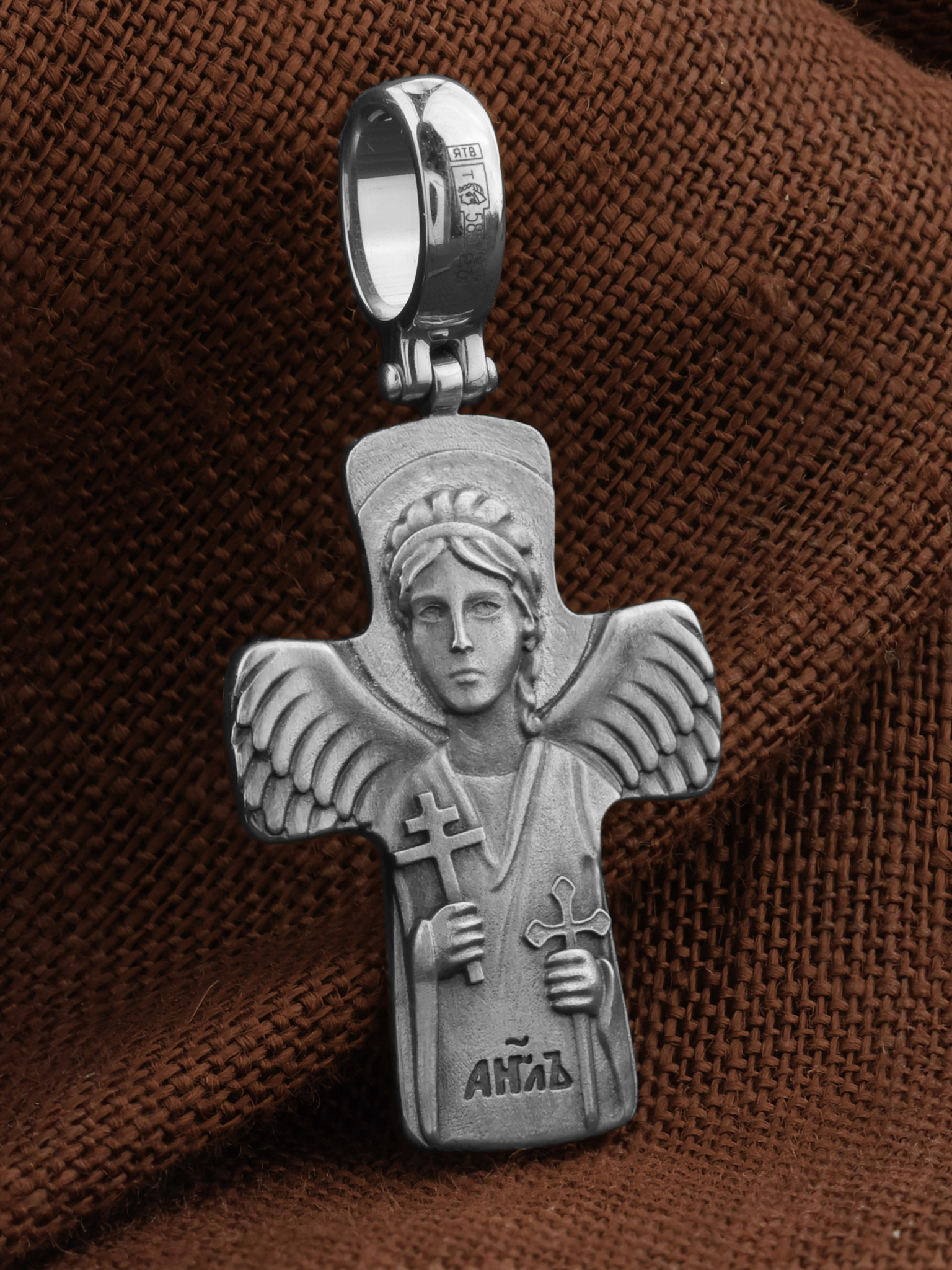 На оборотной стороне креста изображен Святой Ангел-Хранитель держащий в правой руке крест, а в левой — меч. Ангел-Хранитель — это Ангел приставляемый Богом к человеку при крещении для охраны и помощи в добрых делах. Он невидимо находится при человеке на протяжении всей его жизни, если человек сохраняет в себе любовь к Богу и истинную веру перед Ним. Ангел-Xранитель делают для нас все, что служит к истинному нашему благу и спасению. Невидимо пребывая при нас постоянно, он, руководствуя нас ко спасению, не только по нашему желанию таинственно наставляет нас на все доброе и полезное, не только возносит наши молитвы к Богу, но еще и сам от себя охраняют и защищают нас от врагов видимых и невидимых и ходатайствует за нас пред Богом.
