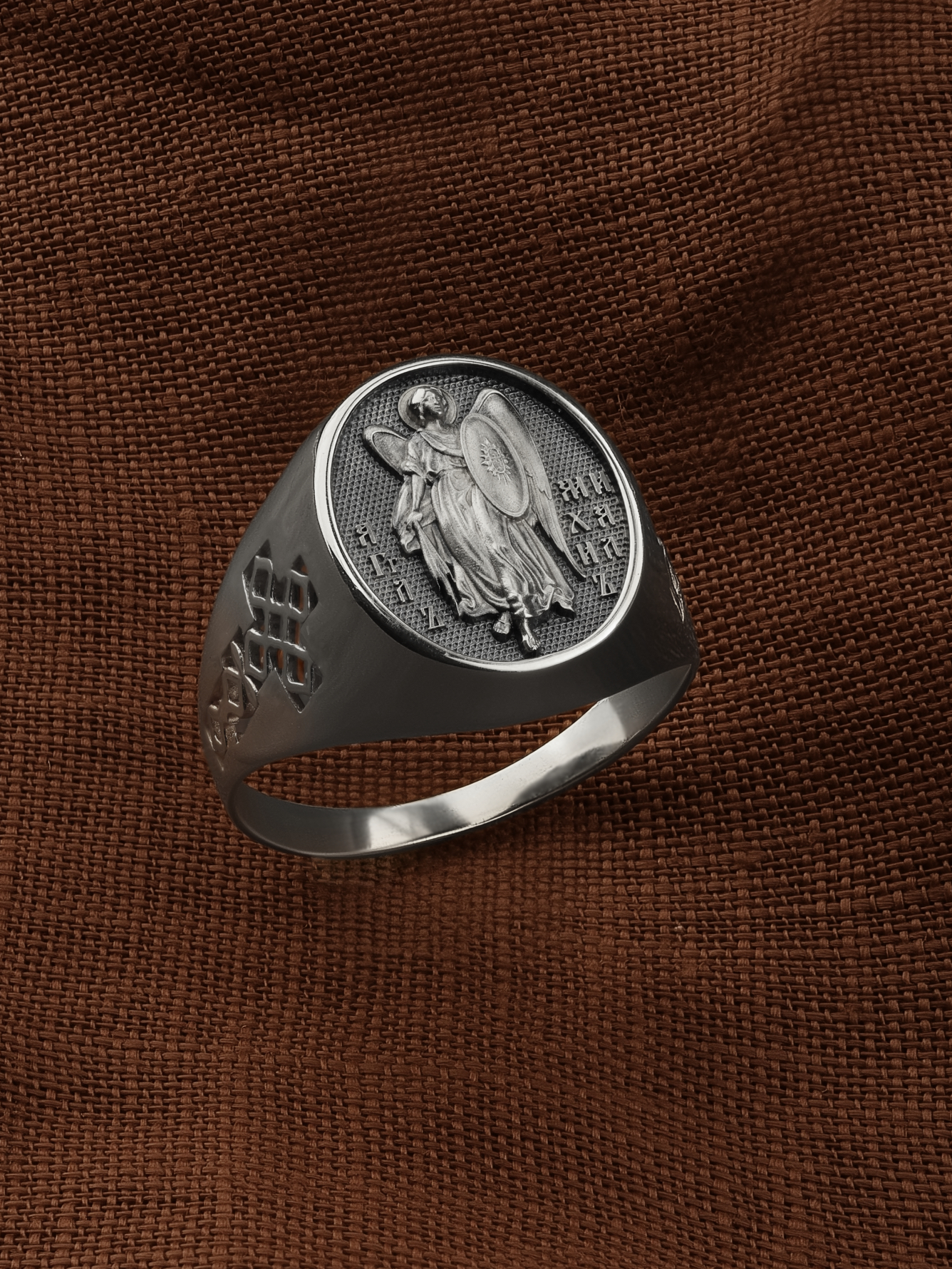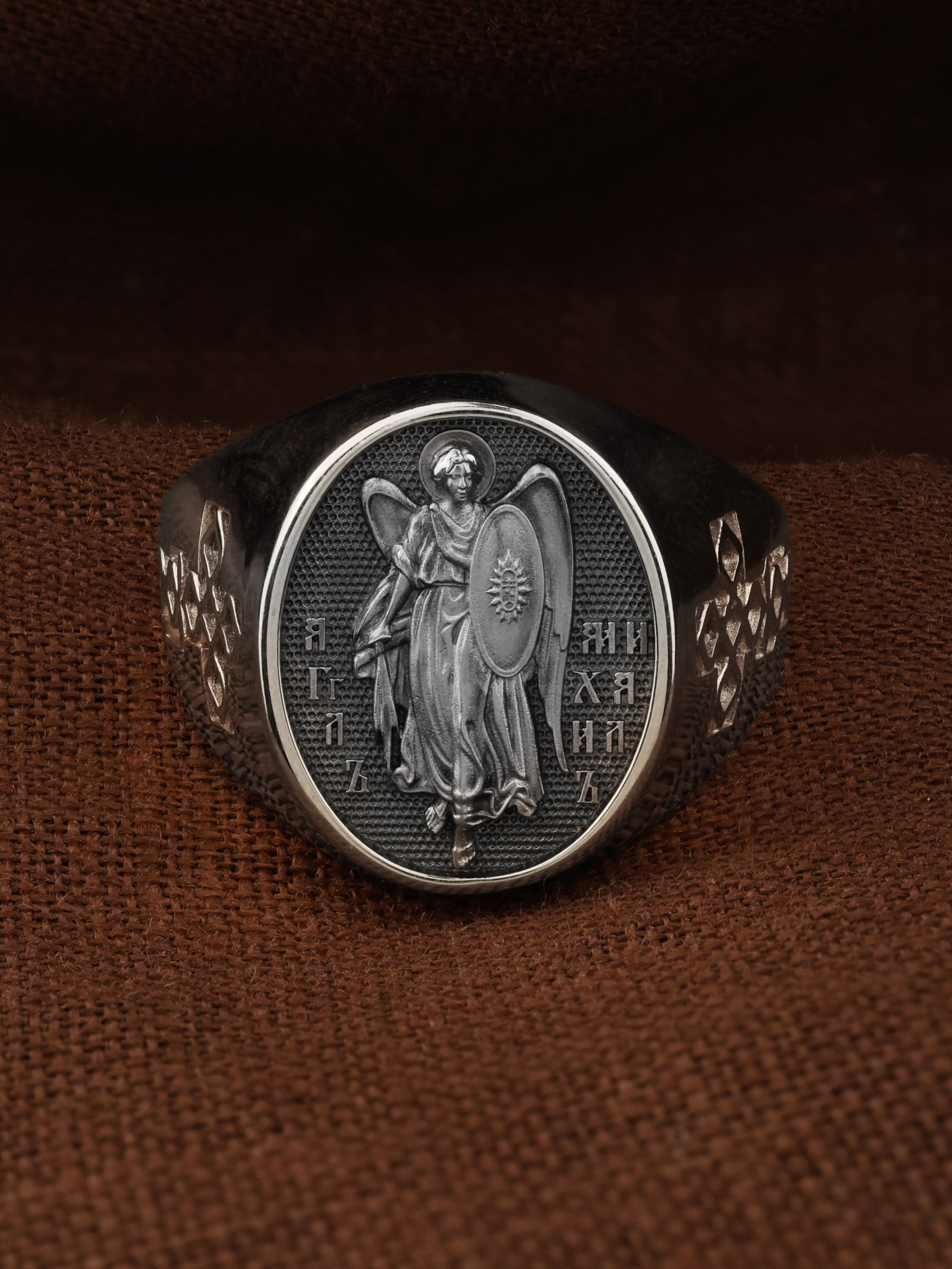 Кольцо «Архангела Михаила» выполнено в древних христианских традициях. В центре помещен образ Архангела Михаила — верного служителя Божия, который низринул с Неба возгордившегося денницу с другими павшими духами. Он изображен в воинственном виде с огненным мечом в правой руке и щитом в левой. В Православии его называют Архистратигом, что означает глава святого воинства Ангелов и Архангелов. Вокруг образа размещена молитва: «Кресту твоему поклоняемся, Христе, честному хранителю мира, спасения нас грешных, велию очистилищу, верным победе».