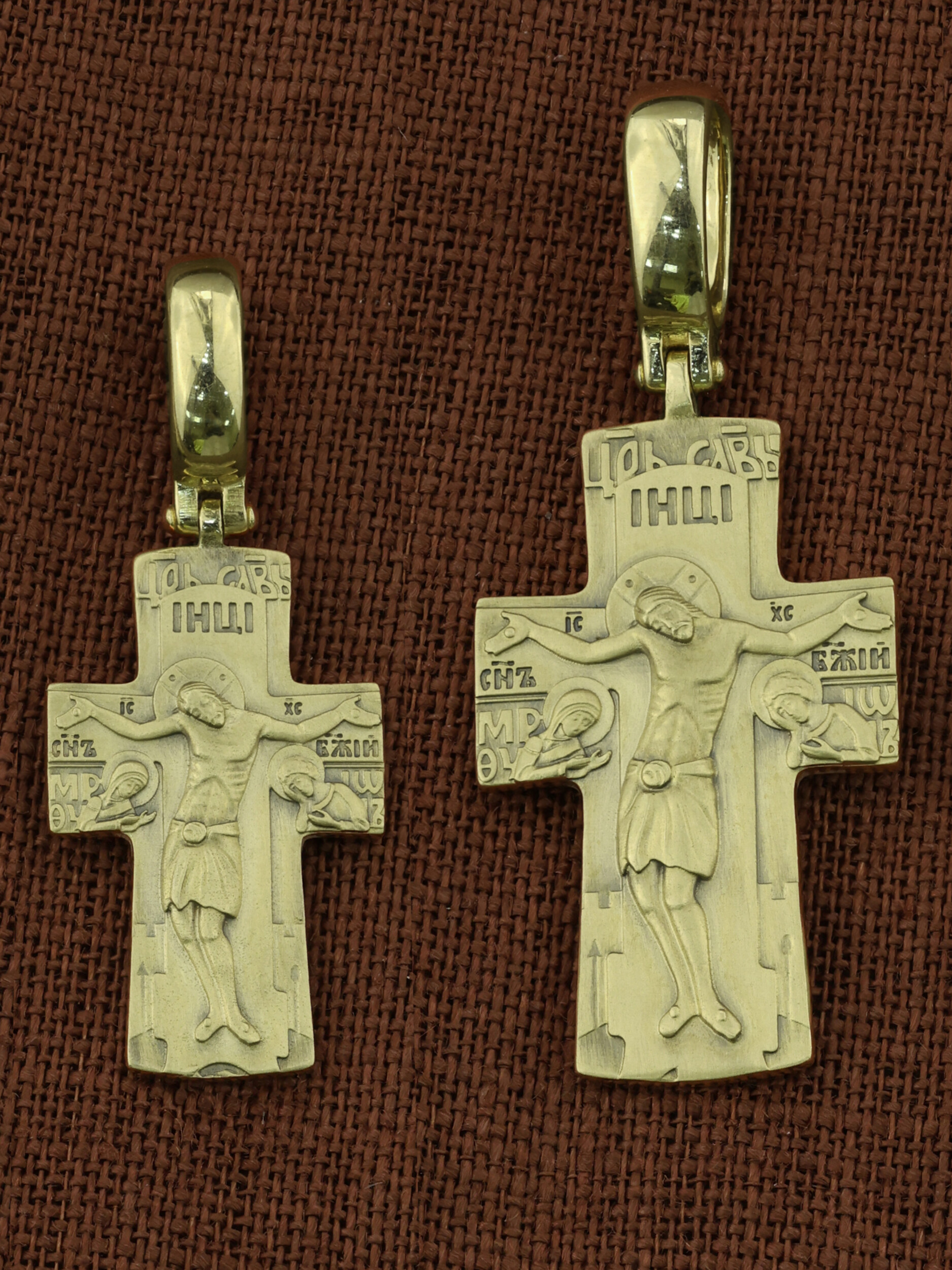 На лицевой стороне креста изображено Распятие Господа и Спасителя нашего Иисуса Христа, отдавшего Себя на смерть, для искупления грехов мира. Крест является символом жертвенной любви Всеблагого Бога к падшим людям, всепобеждающим духовным оружием христиан, основанием и средоточием церковной жизни. Над вершиной Распятия помещена надпись «Царь Славы». На верхней табличке, выше головы Иисуса, расположена надпись, составленная Понтием Пилатом — «IНЦI». Она означает «Иисус Назорей, Царь Иудейский». Распятие сопровождается каноническими надписями. Надпись «IC» «ХC», означает Иисус Христос и словосочетание «СЫН БОЖИЙ», что означает божественную природу Иисуса Христа, помещаются на разных сторонах поперечной перекладины креста. Слева от Распятия изображена Пресвятая Богородица, справа — апостол и евангелист Иоанн Богослов, один из ближайших учеников Иисуса Христа. Вдоль креста изображены копие сотника Лонгина и трость с губкой. За Распятием высится Иерусалимская стена, в знак того, что Господь был распят вне стен города.