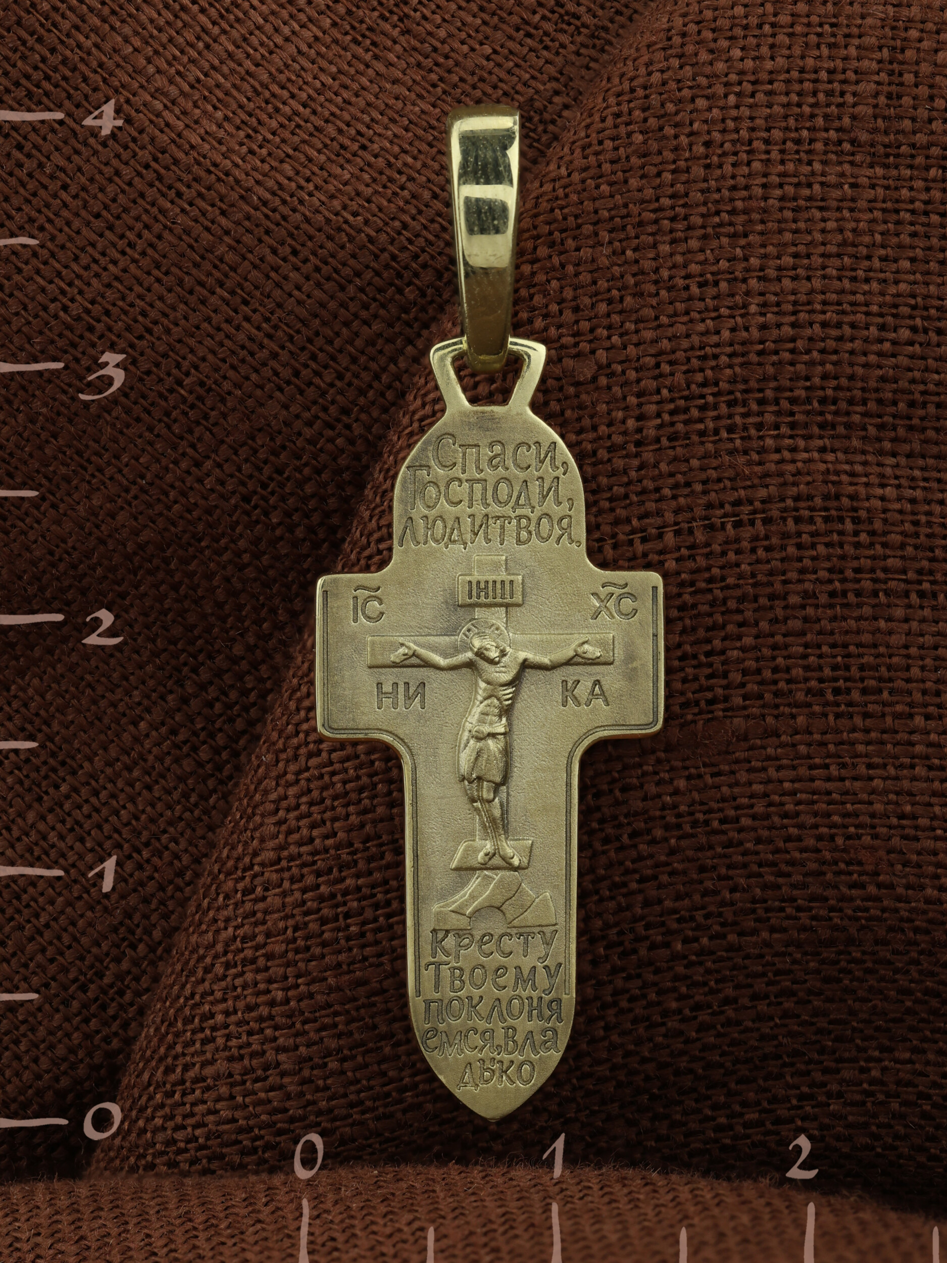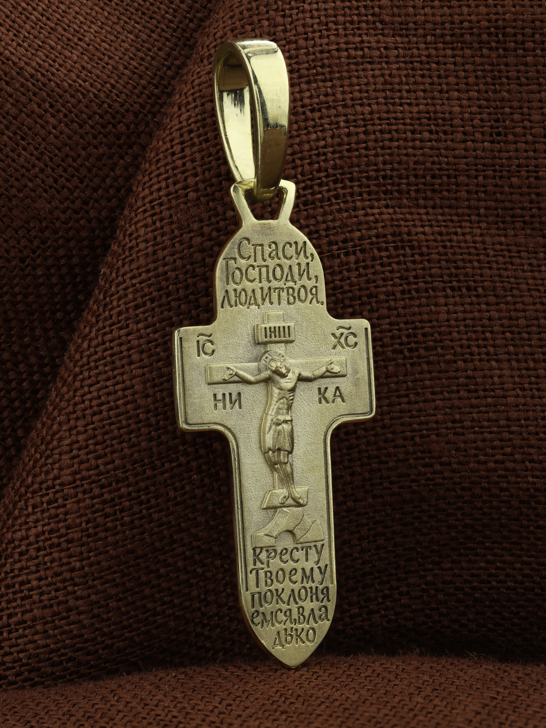 На лицевой стороне креста изображено Распятие Господа и Спасителя нашего Иисуса Христа. Крест- символ спасения и искупления рода человеческого, знамение победы над смертью и адом. Иисус Христос, как искупительная жертва освобождения человечества от власти греха, умер крестной смертью и в третий день воскрес. На верхней табличке, выше головы Иисуса, расположена надпись, составленная Понтием Пилатом — «IНЦI». Она означает «Иисус Назорей, Царь Иудейский». Надпись «IC» «ХC», означает Иисус Христос, помещается на разных сторонах поперечной перекладины креста. Под ней помещено слово «НIКА», что означает Победитель. Крест стоит на горе камней, символизирующих Голгофу.
