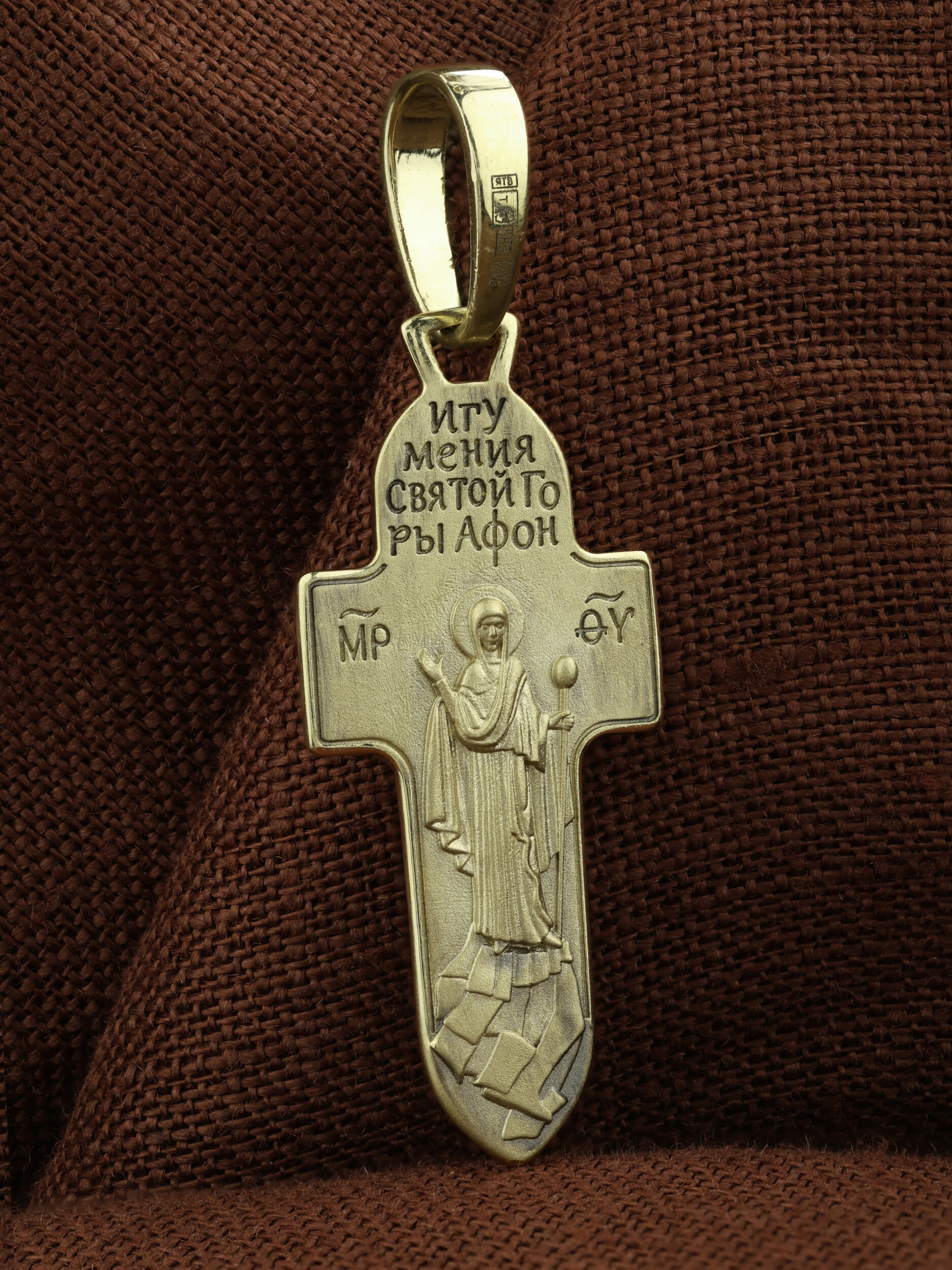 На оборотной стороне креста изображена Икона Божией Матери «Игумения Святой Горы Афонской». Икона написана греческим иконописцем афонского монастыря схимонахом Паисием. Богоматерь изображена с игуменским жезлом над всем монашеским островом. Святое предание связывает появление монашеских обителей на Святой Горе с особым попечительством Пресвятой Богородицы на Афоне. Божия Матерь возвестила евангельское учение жителям горы Афон, которые были язычниками. Народ слушал Ее проповеди, затем уверовал и крестился. Силой Своей проповеди и многочисленными чудесами Богородица обратила местных жителей в христианство. Она поставила там начальником и учителем одного из Апостольский мужей и сказала: «Сие место буди мне и жребий, данный мне от Сына Бога моего».
